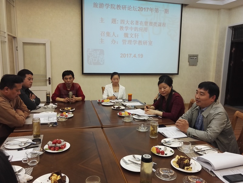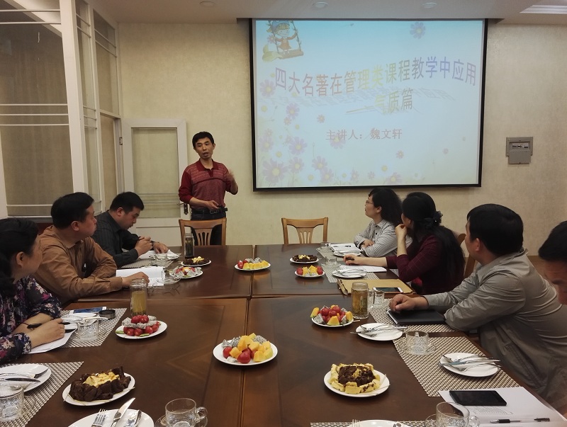 4月19日上午10点,旅游学院管理学教研室主办的旅游学院2017年第一期教学沙龙在经管楼302(西餐模拟室)成功举办。管理学教研室主任魏文轩教授做了题为“经典名著在管理类课程教学中的应用”的教学分享。
