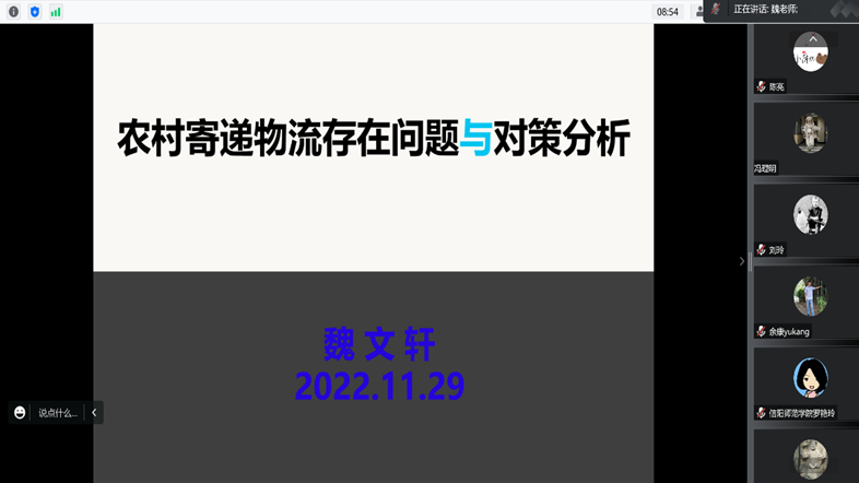 11月29日下午,旅游学院第五期“景明论坛”在腾讯会议平台成功举办。旅游学院魏文轩教授作了题为“农村寄递物流存在问题与对策分析”的学术报告,旅游学院部分师生聆听了报告。