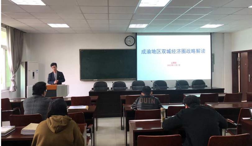 11月1日下午,旅游学院第三期“景明论坛”在经管楼401成功举办。旅游学院副院长江晓晗作了题为“成渝地区双城经济圈战略解读”的学术报告,旅游学院部分师生聆听了报告。