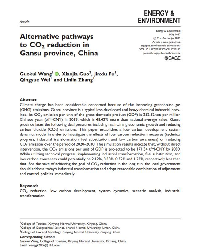 旅游学院王国奎博士在SSCI刊物《Energy & Environment》上发表题为“Alternative pathways to CO2 reduction in Gansu province, China”的学术论文。