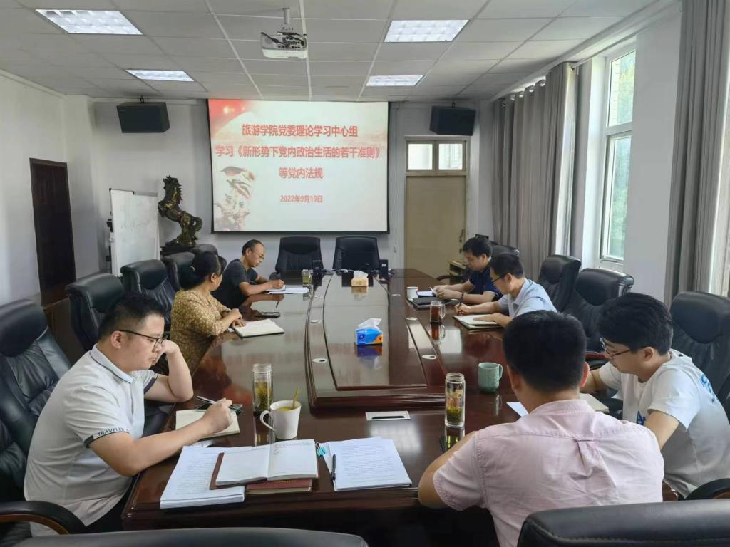 9月19日上午,旅游学院党委理论学习中心组在经管楼404会议室集中学习《新形势下党内政治生活的若干准则》等党内法规。旅游学院党委理论学习中心组成员参加会议。会议由旅游学院党委书记雷前龙主持。