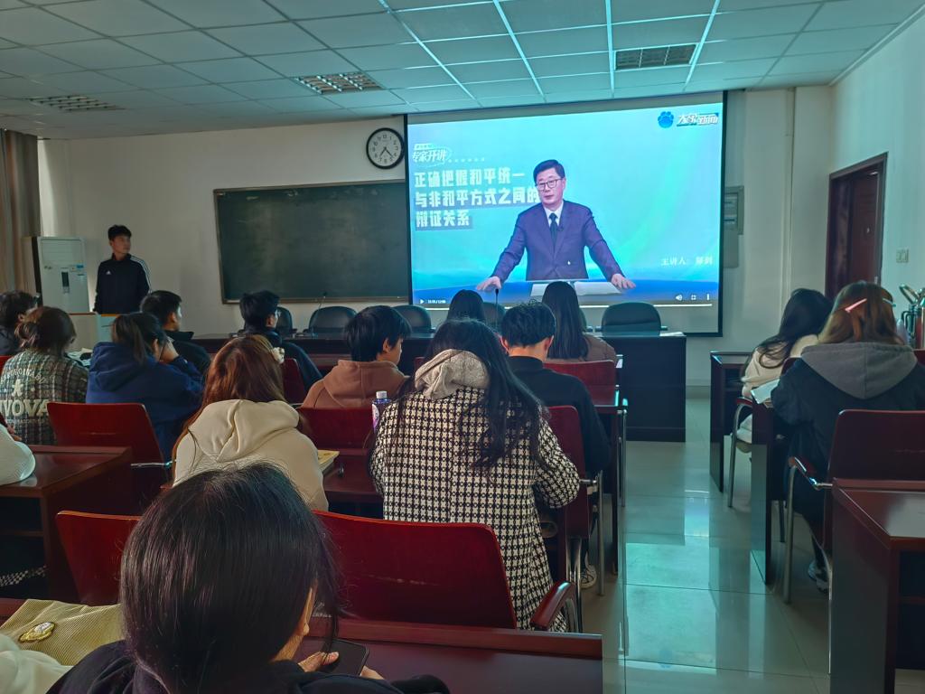 为推动涉台教育机关活动进一步深化,提高学生对中央对台方针政策的认识,11月17日下午15时,旅游学院专职组织员王亚文组织部分学生在经管楼401室收看了全国台湾研究会理事郑剑教授的正确把握和平统一和非和平方式的辩证关系专题讲座。