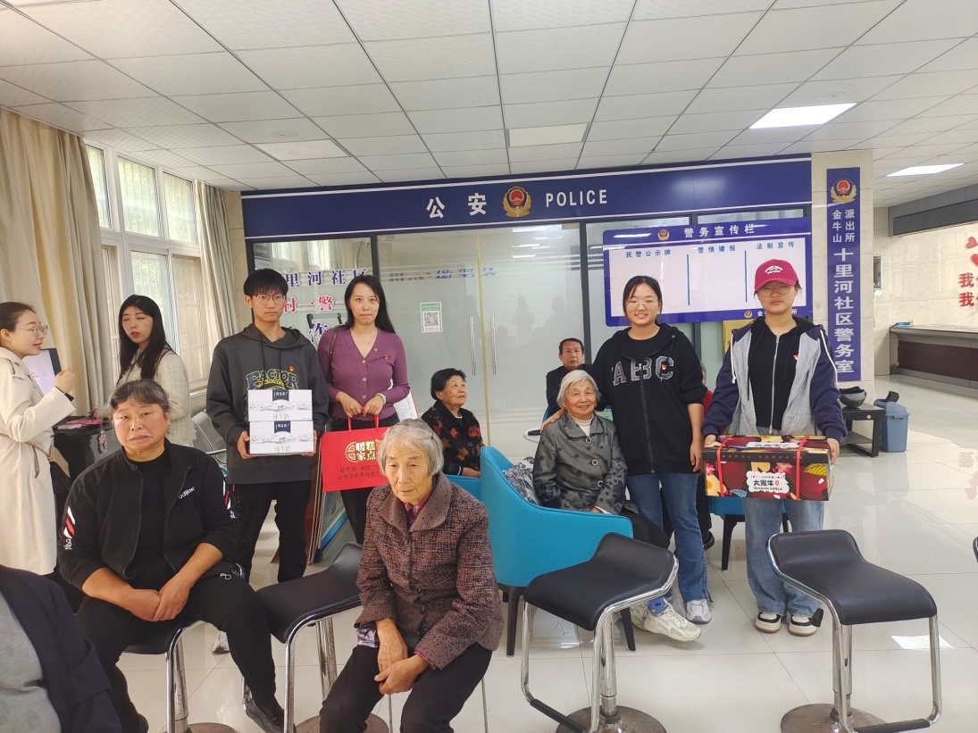 当天上午,旅游学院党支部党员怀着真挚之心,带着牛奶、苹果、月饼等慰问品来到十里河社区,用实际行动为老人们送去关爱和温暖,帮助老人树立紧跟党走、乐观向上的思想,切实提升老人们的获得感、幸福感和归属感。闫会姝老师与老人们共话中秋,欢度国庆,表达了对老人们的亲切关怀和祝福。党员李亚倩详细询问老人的家庭情况与身体状况,了解老人的饮食安排和生活所需,叮嘱老人要多注意饮食,保持良好的作息习惯,有问题及时向组织反映。
