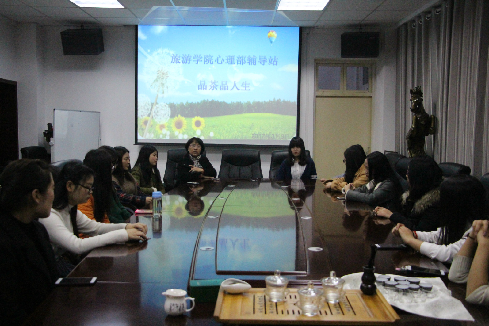 为了弘扬我国茶文化,加深学子对茶文化的认识,3月3日晚,旅游学院心理部辅导站“品茶品人生”茶文化讲座在经管楼会议室举行。我院党委副书记张晓峰,团委书记杨鑫,心理辅导员路璐与10余名学生代表共同参与此次会议。