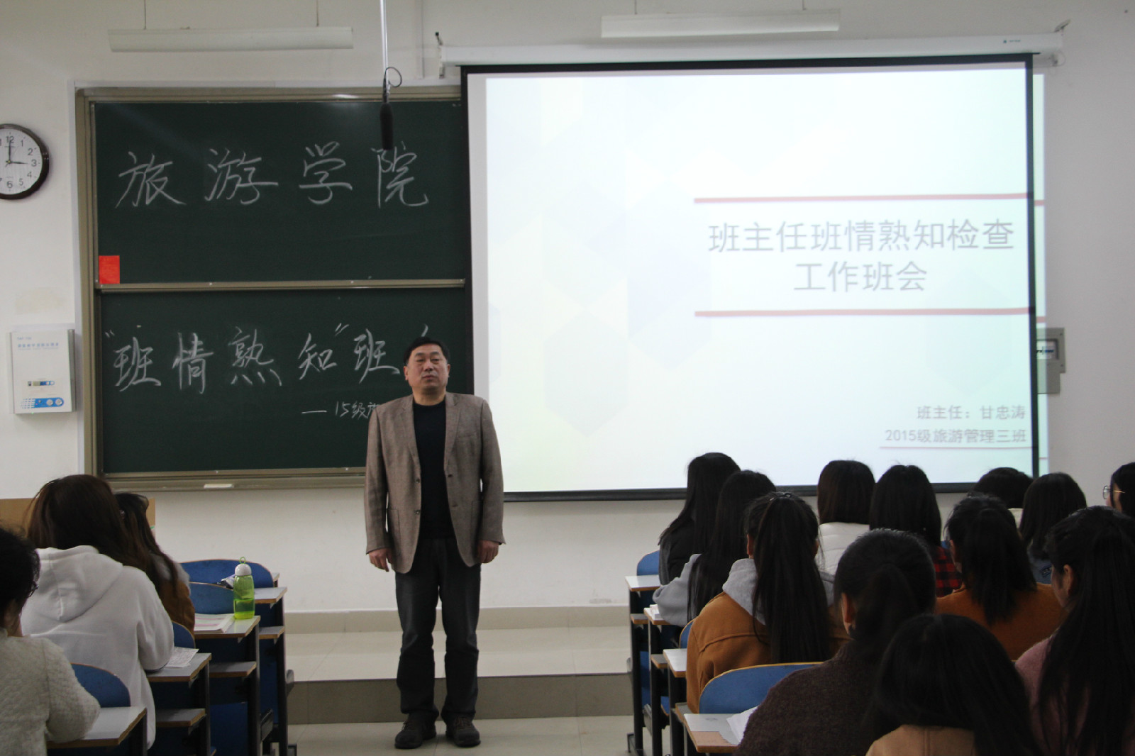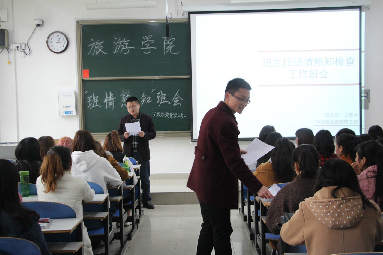 为响应学生处下发的《关于开展辅导员(班主任)班情熟知检查工作的通知》,3月17日下午,旅游学院2015级旅游管理三班班情熟知检查工作主题班会在经管楼202教室顺利召开。学生处副处长严彬,管理科科长黄树余及我院党委书记曹明贵,副书记张晓峰携全体辅导员参加班会。