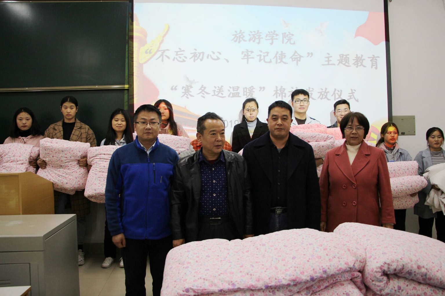 爱心助未来,棉被暖寒冬。11月19日下午,旅游学院于经管楼106进行“寒冬送温暖”活动。旅游学院党委书记曹明贵、党委副书记张晓峰等领导老师参加此次发放仪式。仪式由团委书记张庆敏主持。