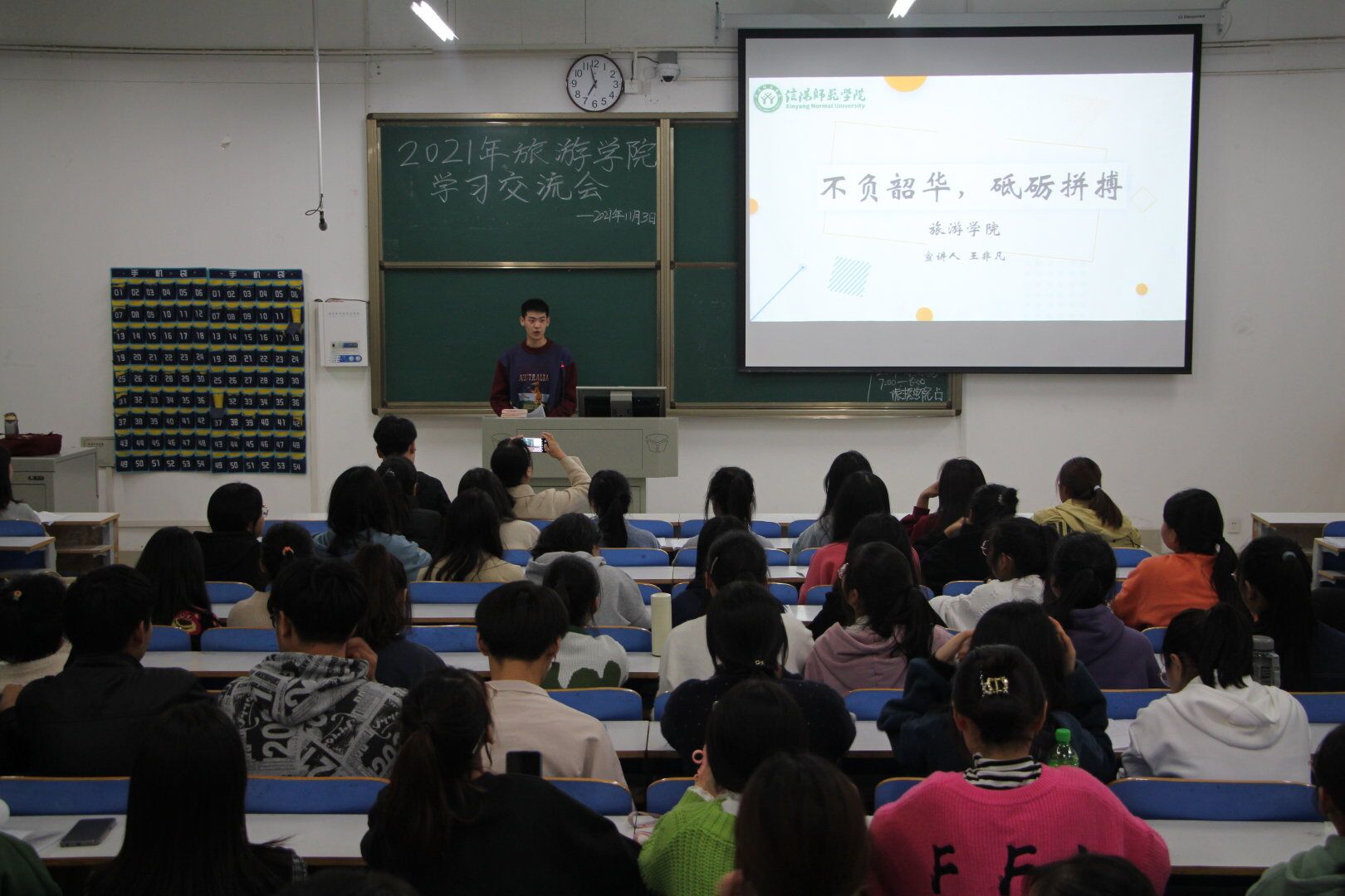 本次活动由优秀学生代表王非凡从自立自强、以学为本、扎实工作、锻炼综合能力四个方面畅谈自己四年大学是如何在学习功底薄弱的情况下坚持学习,在学生工作和个人学习中两不误。通过面对面交流,心与心的沟通,各方思想碰撞,优秀学子用日积月累的经验帮助培养我院“初生牛犊”的闯劲,用渐趋渐广的眼界帮助我院新生开启遨游在知识海洋的新航道。通过此次交流会使同学们更好的适应大学这个新环境,同时拉进了我院学子之间的距离。在同学们在掌声中欢送王非凡同学离开教室。最后,路书记从思想上、学习上、生活上和纪律上做出总结,希望同学们珍惜韶华,养成良好的习惯。勤奋学习,争做新时代新青年,鼓足干劲力争上游。