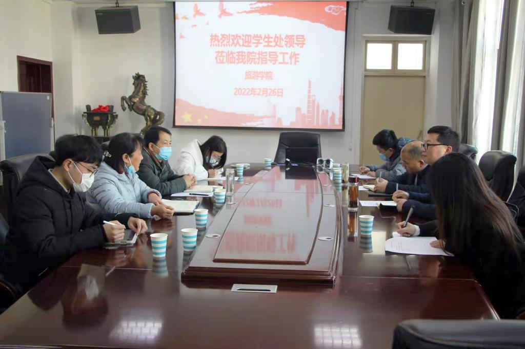 2月26日上午,学生处处长王建旭、副处长雷梁一行莅临我院调研指导学生工作,旅游学院领导班子以及全体辅导员参加了调研座谈。会议由旅游学院党委书记雷前龙主持。