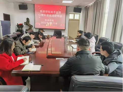 为进一步加强对学生心理状况的把控和研判,及时掌握学生心理动态,旅游学院于2月21日在经管楼404召开心理异常情况研判会,我院党委书记雷前龙、副书记路璐,副院长胡宝珠、江晓晗以及各年级班主任参加此次会议,会议由党委书记雷前龙主持。