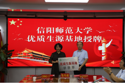 为进一步提高生源质量,吸引更多优秀学子报考信阳师范大学。6月20日下午,信阳师范大学旅游学院党委副书记路璐、副院长吴国琴等一行四人赴商丘市实验中学举行“优质生源基地”签约授牌仪式,商丘市实验中学校长刘庆华、党委副书记康净雪、党委委员王志、相关处室主任及教师代表等人出席签约仪式。