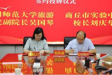 座谈会上,商丘实验中学校长刘庆华对我校一行的到来表示热烈的欢迎,并简要从学校办学历史、基础设施、师资力量、教学成绩、校园文化等方面介绍了近年来的发展状况,希望双方在更高层次、更宽领域中深化交流合作,开启高水平、多层次的对话与互动,从而达到教育双赢的目的。随后旅游学院党委副书记路璐详细介绍了该校的历史沿革、招生规模、教学成绩、科研成果等基本情况,围绕旅游学院师资队伍、专业建设、学生规模和就业前景等进行深入地解说。她表示,通过优质生源基地的平台建设,进一步推动双方在各方面的深度交流与合作,共同助力人才培养,为社会输送更多优秀学子。最后,旅游学院副院长吴国琴、副书记路璐与商丘市实验中学校长刘庆华代表双方签署“优质生源基地”协议并举行授牌仪式。