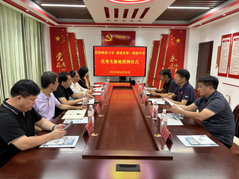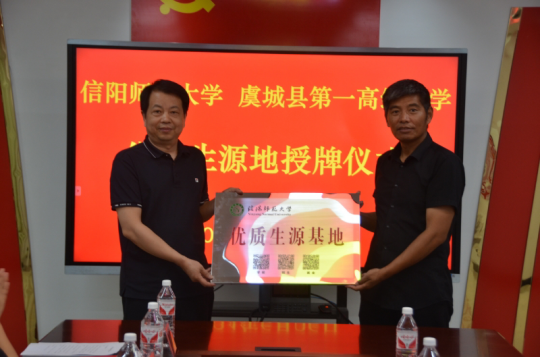 为了进一步加强高校与中学之间的交流合作,优化生源结构和提升生源质量,6月26日上午,信阳师范大学旅游学院党委书记雷前龙、党委副书记路璐、旅游管理系主任罗艳玲、就业工作秘书黄倩一行四人赴商丘市虞城县第一高级中学举行“优质生源基地”签约授牌仪式暨招生宣传工作,商丘市虞城县教体局副局长杨海旺、商丘市虞城县第一高级中学党委书记余坤、校长李连生、信阳师范大学商丘校友会会长、商丘市基础教育发展中心主任李青峰、信阳师范大学商丘校友会秘书长郑华鑫等出席签约仪式。