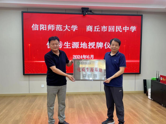 为了进一步加强高校与中学之间的交流合作,拓展优质生源选拔渠道。6月25日,旅游学院党委书记雷前龙、副书记路璐、旅游管理系主任罗艳玲、就业工作秘书黄倩一行四人赴商丘市回民中学召开“优质生源基地”签约授牌仪式暨招生宣传工作。商丘市回民中学党委副书记王兴林、副校长任青、党委委员郑艳君、教务处主任刘凯、校高招办主任李朝阳、商丘市基础教育发展中心主任李青峰、信阳师范大学商丘校友会秘书长郑华鑫出席本次签约仪式。
