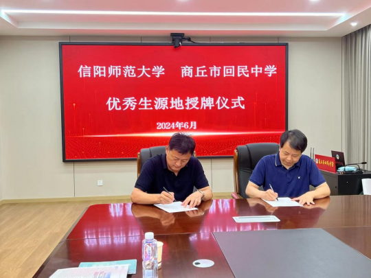 座谈会上,商丘市回民中学党委副书记王兴林对我校一行的到来表示热烈欢迎和由衷的感谢。并从学校发展历史、师资力量、学生规模、办学成果、发展规划等方面进行了详细介绍,他表示,学校始终坚持育人为本,实施素质教育,促进学生全面发展,能够为信阳师范大学输送更多的优秀学子。旅游学院党委雷前龙详细介绍了我校的办学历史、师资条件、办学规模、招生情况等,并期望通过优秀生源基地建设的契机,加强两校交流与合作,共同探索人才培养新思路、新路径。最后,旅游学院党委书记雷前龙与商丘市回民中学党委副书记王兴林代表双方签署“优质生源基地”协议并举行授牌仪式。