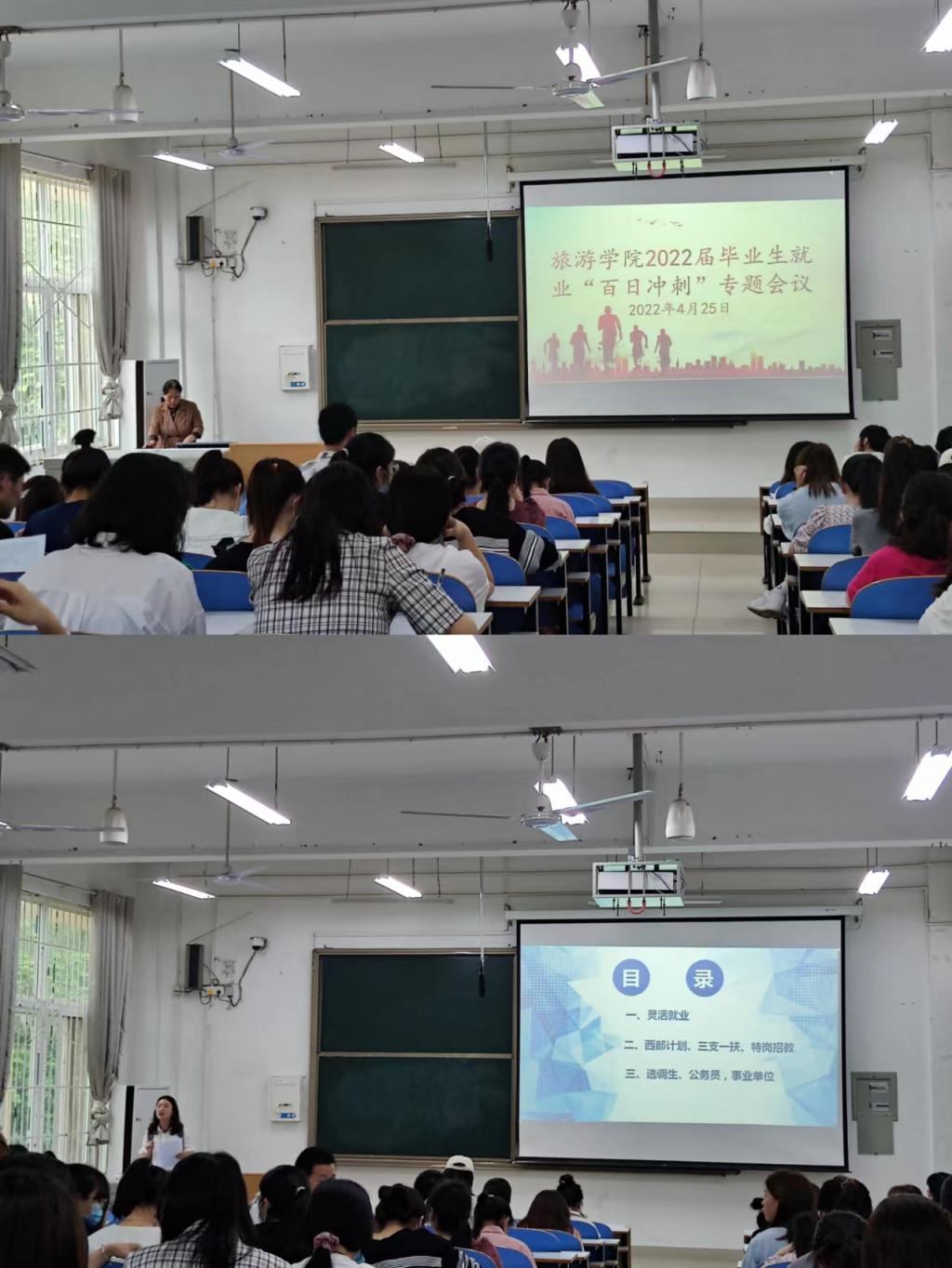 2022年4月25日下午,为切实做好我院毕业生就业工作,缓解当今大学毕业生就业压力,旅游学院在经管楼201召开2022届毕业生就业“百日冲刺”专题会议。旅游学院副书记路璐、就业秘书黄倩、18级全体学生参加会议,会议由副书记路璐主持。