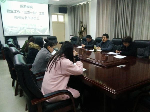 为给2017届毕业生提供优质就业服务,促进就业工作更好开展,11月29日上午,旅游学院报考公务员动员大会在经管楼401会议室顺利召开。院党委副书记张晓峰,副处级辅导员路璐,就业工作秘书甘忠涛老师及毕业班班委与应届毕业生代表出席会议。