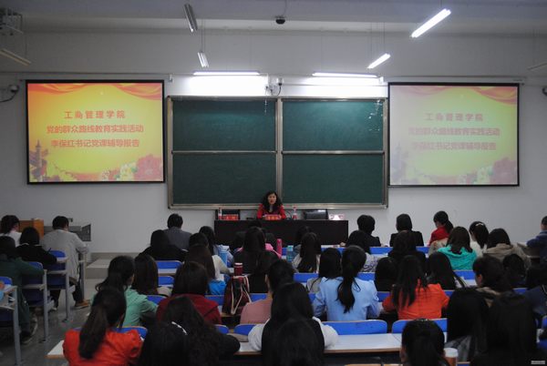 4月17日晚,工商管理学院党总支书记李保红教授在社科楼215教室作了一场党的群众路线教育实践活动专题报告会,该院师生党员和部分入党积极分子近200人参加了报告会,报告会由工管学院党总支副书记李辉主持。