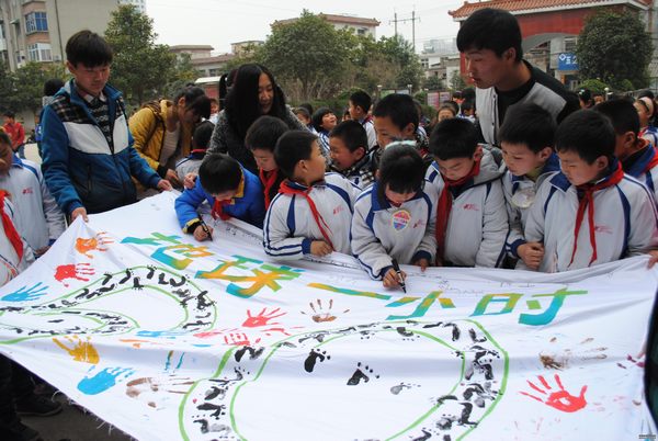 在小学工作人员的热情接待下,志愿者分成两队为三年级小学生授课。面对老师的提问,小学生们跃跃欲试,各抒己见。紧接着,志愿者对同学们进行碳足迹知识的普及,并通过问卷互动的方式累计评出生活中的环保小贴士。授课过程中,志愿者认真阐述、耐心讲解,并提倡要把环保口号切实落实到实际行动中去,参与学生积极配合、踊跃参与,现场其乐融融。随后,参与者在“地球一小时”宣传画布上签名,气氛十分热烈,同学们纷纷表示会从小事做起,保护美丽的地球。