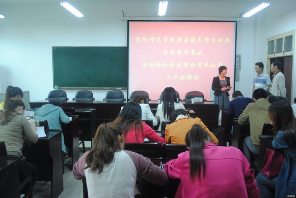 9月10日上午,工商管理学院携手信阳师范学院国家级大学生社会实践教育基地河南羚锐制药股份有限公司在经管楼会议室举办人才招聘会,党总支副书记李辉,团总支书记周明成向羚锐公司招聘负责人介绍学院概况和前来应聘学生的基本情况,协调组织好各项工作,保证人才招聘会顺利举行。