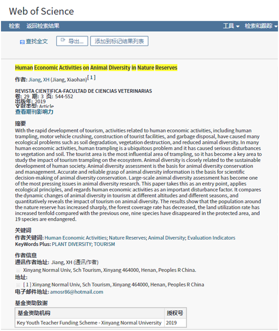 近日,旅游学院江晓晗博士在SCI刊物《Revista Cientifica-facultad de Ciencias Veterinarias》上发表题为:Human Economic Activities on Animal Diversity in Nature Reserves的论文。