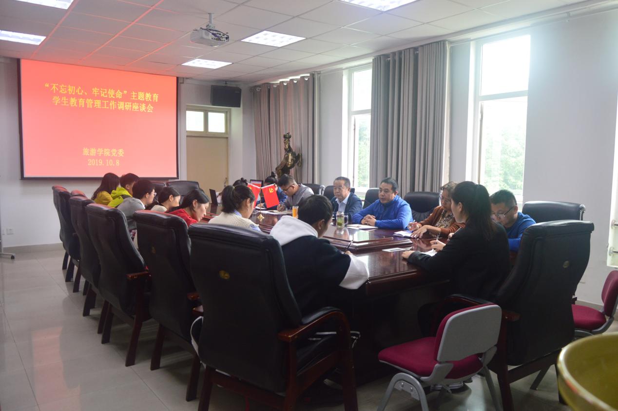 10月8日,旅游学院在经管楼403召开“不忘初心,牢记使命”主题教育学生教育管理工作座谈会。党委书记曹明贵、党委副书记张晓峰、专职辅导员、学生代表参加此次座谈会。会议由张晓峰主持。