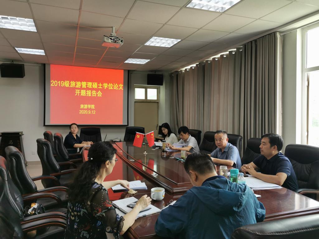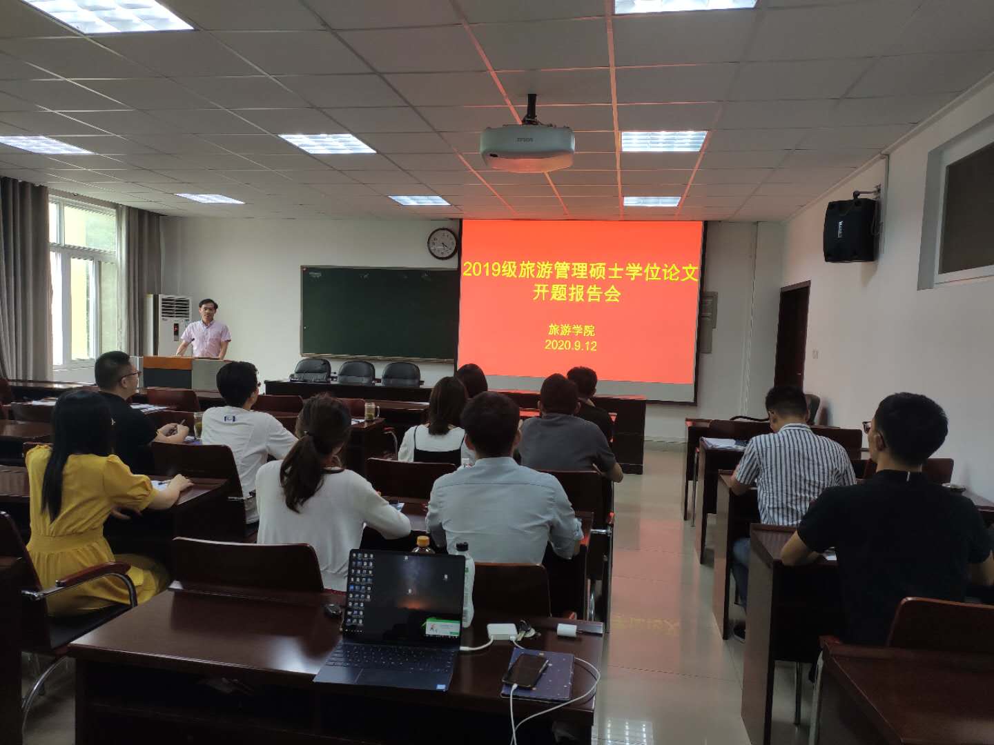 9月12日下午,旅游学院2019级旅游管理硕士研究生毕业论文开题报告会分两组在经管楼401和403会议室同时举行。院长彭荣胜和党委书记曹明贵分别任两组评审小组组长并主持报告会。