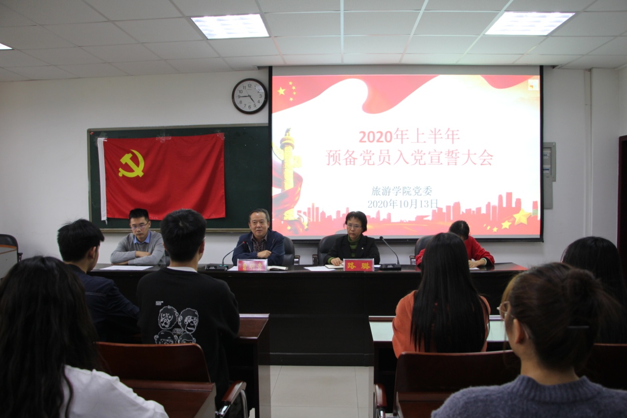 受疫情影响,旅游学院党委预备党员入党宣誓大会推迟至10月14日下午,在经管楼401举行。旅游学院党委书记曹明贵、副处级辅导员路璐、学生党支部书记郑征、专职组织员闫会姝和旅游学院全体学生党员及入党积极分子参加此次会议。会议由路璐主持。