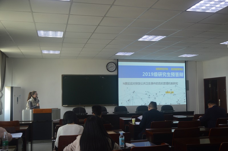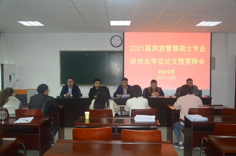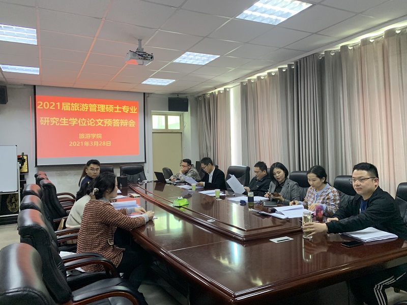 3月28日下午,旅游学院2021届硕士研究生毕业论文预答辩会分两组在经管楼401和403会议室举行。为切实提高学位论文质量,本次预答辩采取导师回避原则,评委主席分别由商学院杜辉教授和地理科学学院高军波教授担任,委员由业界与校内导师8人组成。
