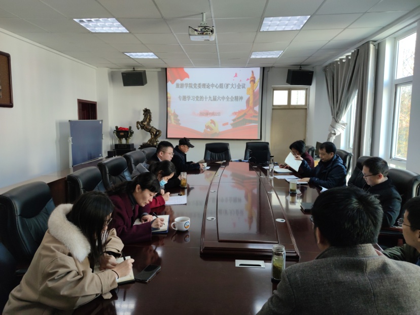 为学习贯彻习近平总书记在党的十九届六中全会上的报告。11月22日下午,旅游学院党委理论学习中心组成员、各党支部书记在经管楼404开展专题学习党的十九届六中全会精神扩大会议。
