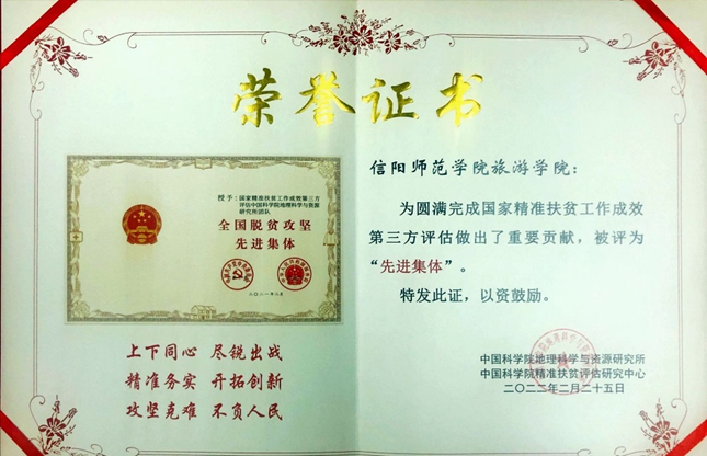 2022年2月25日,在全国脱贫攻坚取得全面胜利一周年之际,中国科学院精准扶贫评估研究中心、中国科学院地理科学与资源研究所举行“脱贫攻坚成效评估总结表彰暨可持续减贫与发展研讨会”,会议对参与国家精准扶贫工作成效第三方评估团队优秀集体、优秀个人进行了表彰,信阳师范学院旅游学院被评为“先进集体”,高军波、孙健武被评为“先进个人”。
