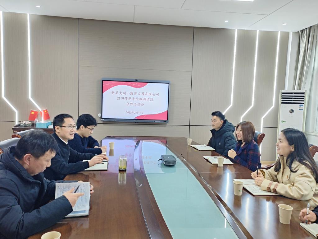 为促进校企合作、产教融合,创新人才培养方式,培养更多的旅游应用型人才。2023年2月11日下午,新县大别山露营公园有限公司董事长殷林一行来我院洽谈推进校地合作事宜,院长高军波、副院长江晓晗以及罗艳玲、李友亮、刘玲等老师参加座谈会。