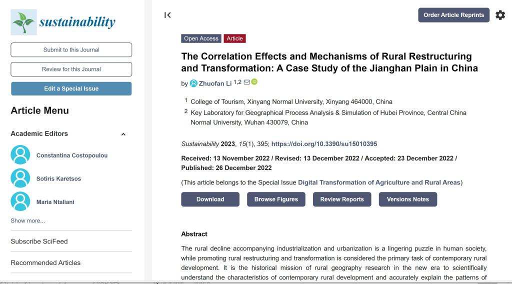 旅游学院李卓凡博士在SSCI期刊《sustainability》(2022年影响因子:3.889)上发表题为“The Correlation Effects and Mechanisms of Rural Restructuring and Transformation: A Case Study of the Jianghan Plain in China”的学术论文。