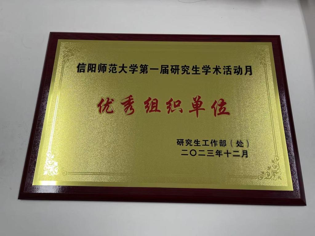 在信阳师范大学第一届研究生学术活动月期间,学院组织全体研究生开展了优秀学术论文评选、“红25军长征路线”调研成果汇报、学术论坛和学术明星评选等系列活动。我院脱颖而出,荣获“优秀组织单位”荣誉称号。