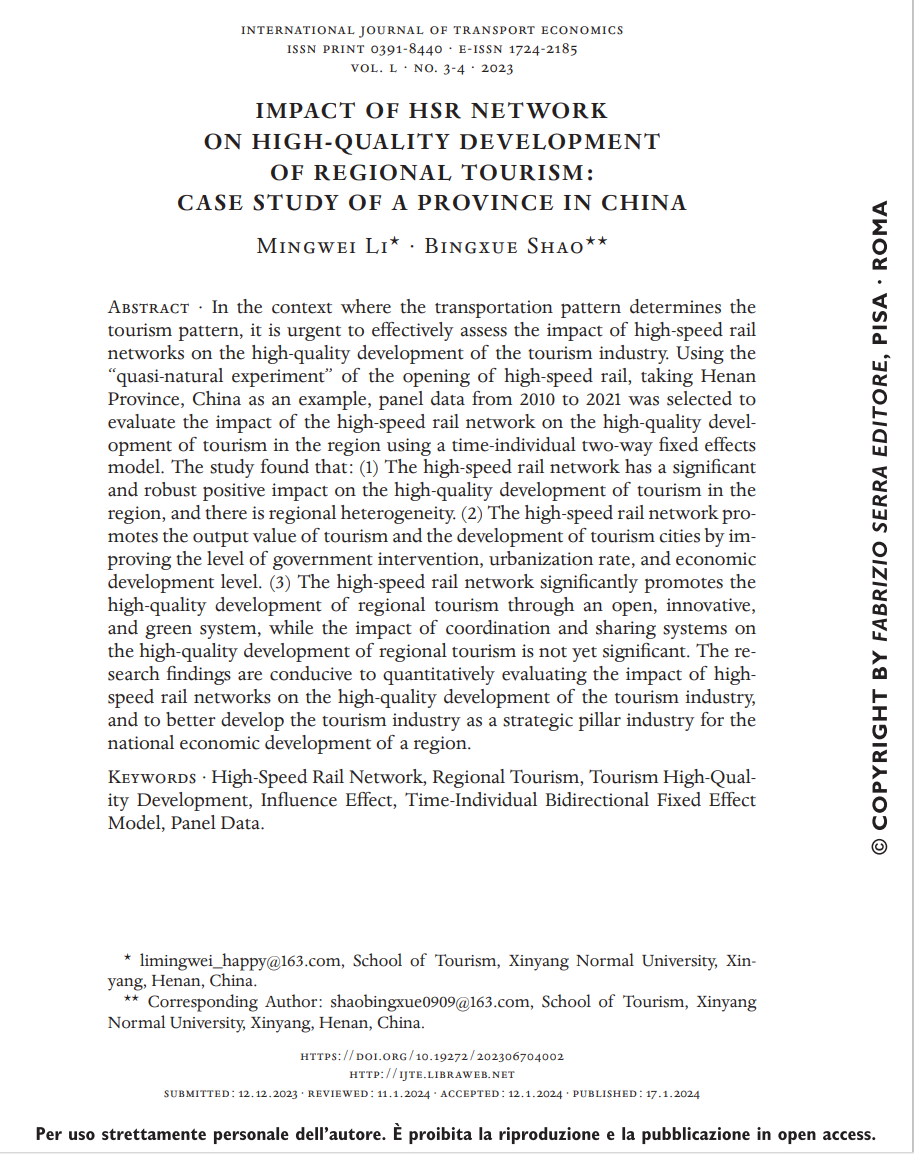 近日,旅游学院李明伟博士在SSCI期刊《International Journal of Transport Economics》发表题为“Impact of HSR Network on High-Quality Development of Regional Tourism: Case Study of a Province in China”(DOI: 10.19272/202306704002)的学术论文。