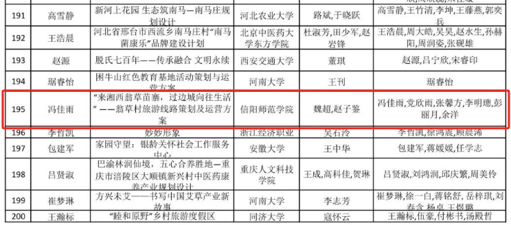 近日,全国大学生乡村振兴大赛竞赛委员会公布了《第二届“两山杯”全国大学生乡村振兴创新创意创业大赛创意赛道立项公示》,旅游学院“星辰大海”团队申报的“来湘西翁草苗寨,过边城向往生活——翁草村旅游线路策划及运营方案”项目经大赛专家评审组评审通过后予以立项。