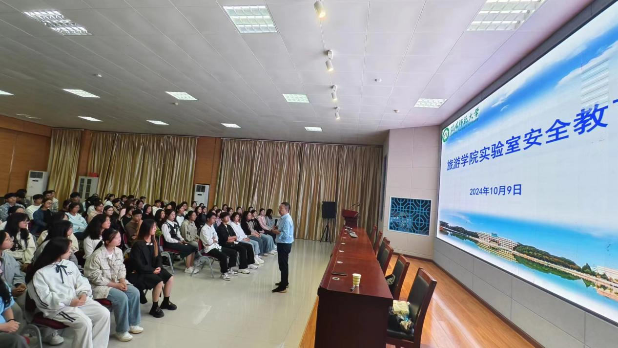 为落实“河南省高校第四届实验室安全文化宣传月”活动,10月9日晚,旅游学院实验室主任李友亮副教授在综合楼601旅游虚拟仿真实训室,围绕实验室安全中的“知易行难”的问题,结合我院实验室实际,为2024级新生开展实验室安全教育讲座。