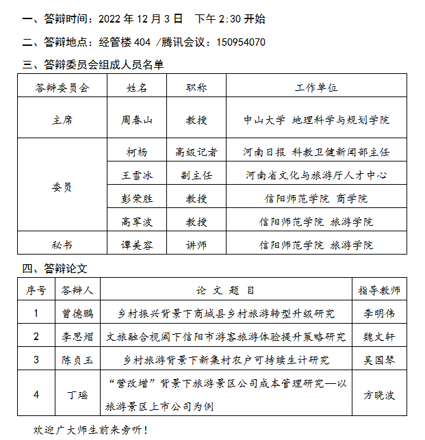 旅游学院2022年下半年硕士研究生学位论文答辩公告