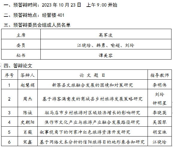 旅游学院2023年硕士研究生学位论文预答辩公告