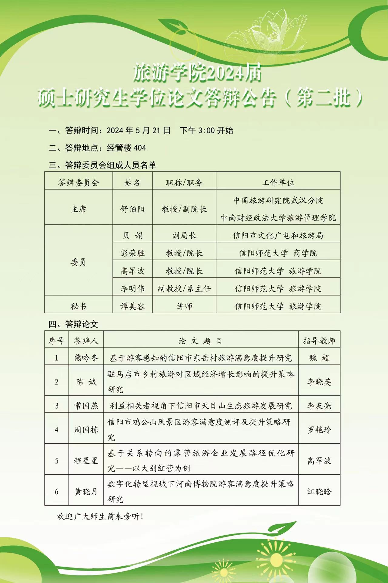 旅游学院2024届硕士研究生学位论文答辩公告(第二批)