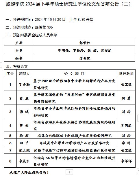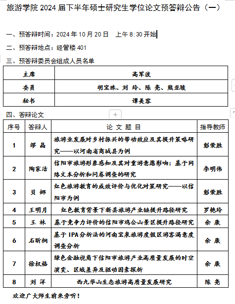 旅游学院2024届下半年硕士研究生学位论文预答辩公告