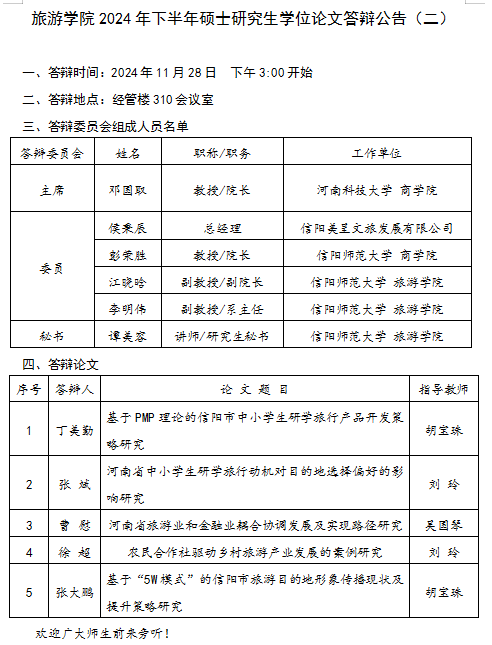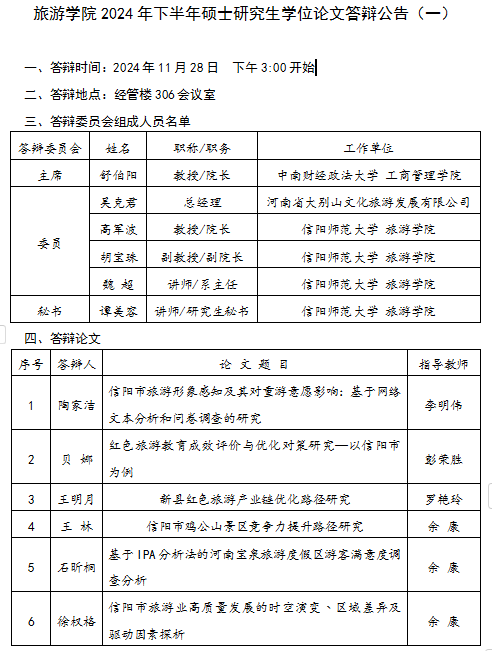旅游学院2024年下半年硕士研究生学位论文答辩公告